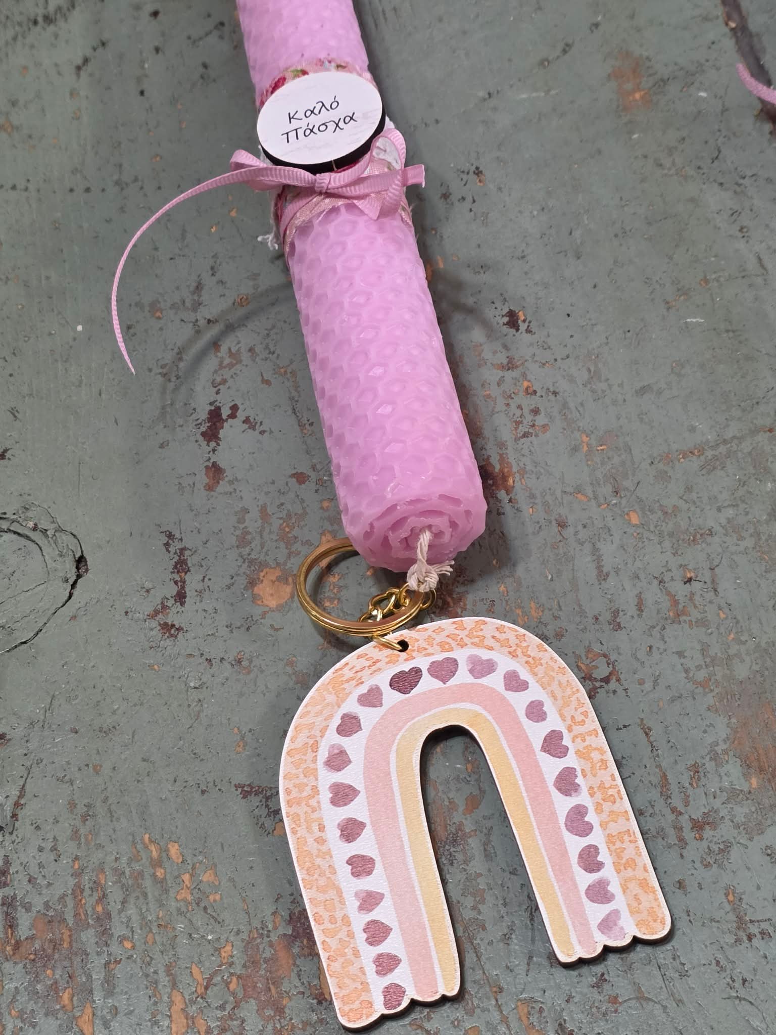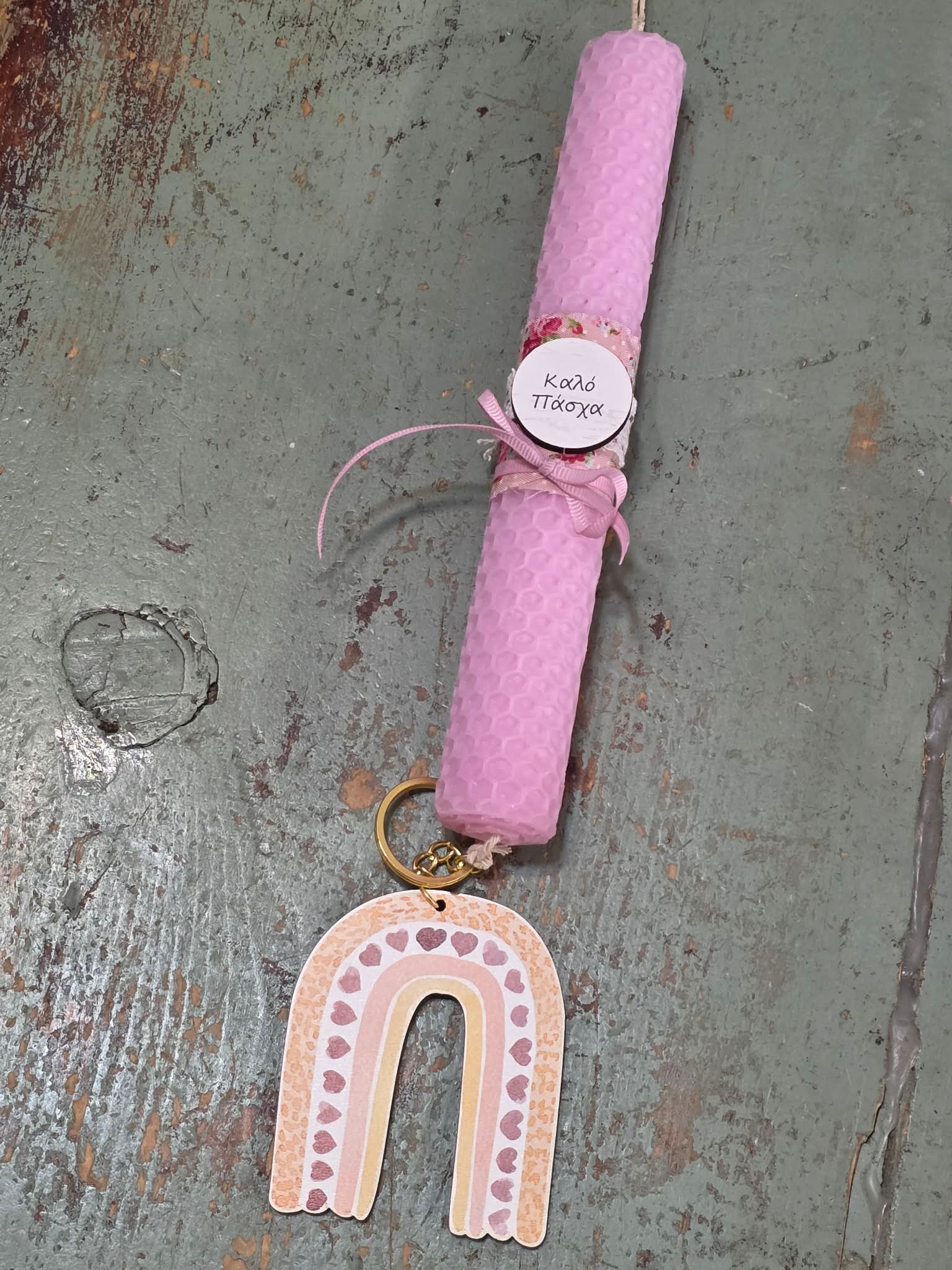 Αρωματική ροζ λαμπάδα μελισσοκέρι με μπρελόκ “ουράνιο τόξο”