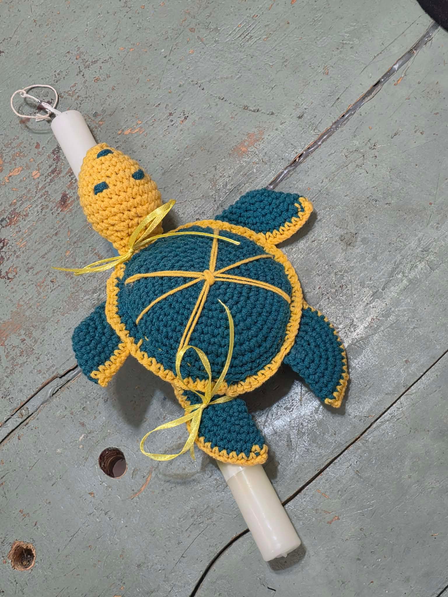 / Λευκή λαμπάδα με πλεκτή χελώνα