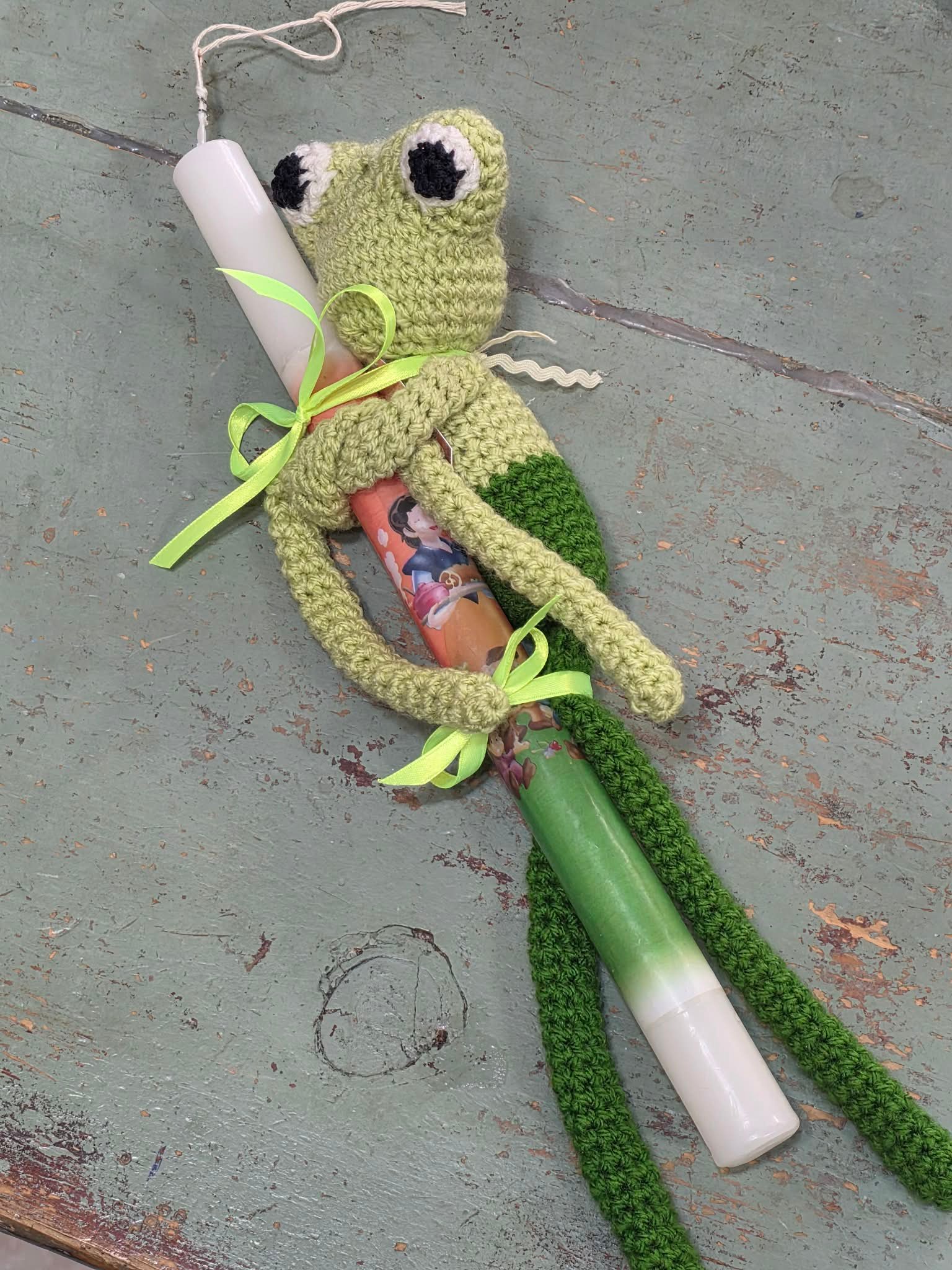 / Πολύχρωμη λαμπάδα με πλεκτό βάτραχο